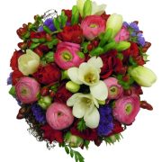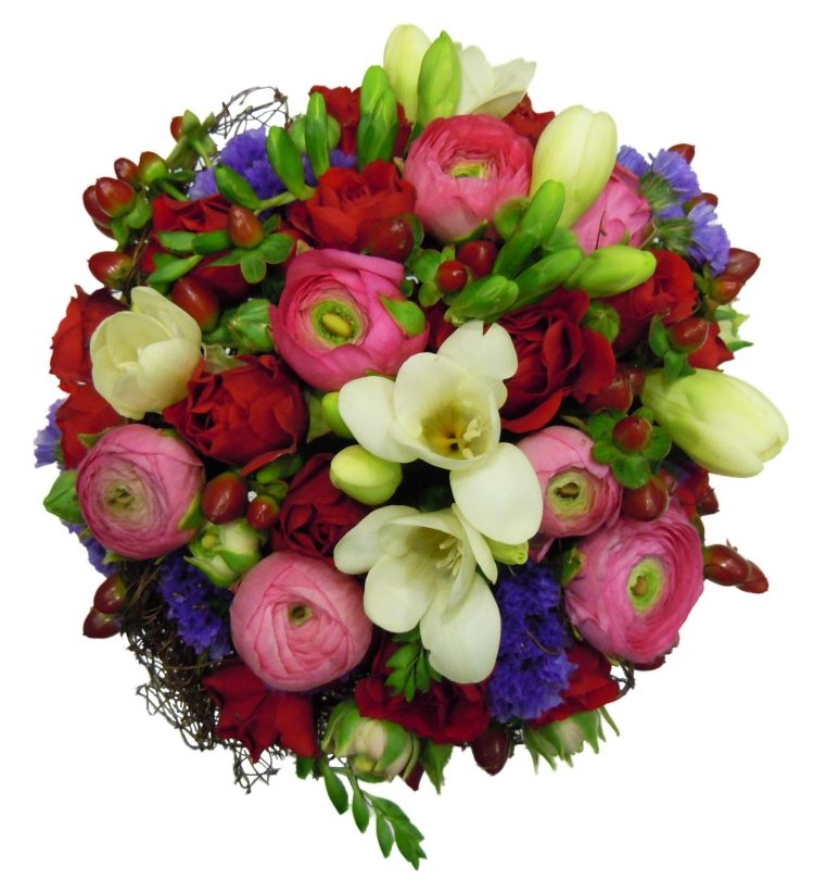 Poročni šopek izraža igrivost barvnih kombinacij. Sestavljajo ga mini vrtnice, ranuncole, frezije in statice. Peclji šopka so poviti z okrasnim trakom.