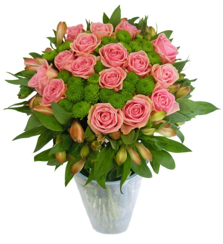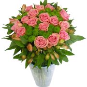Šopek iz roza vrtnic, santini marjetic in alstromerij.
