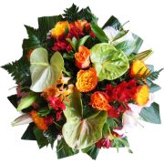 Žalni aranžma iz flaminga, vrtnic in astromerij.
